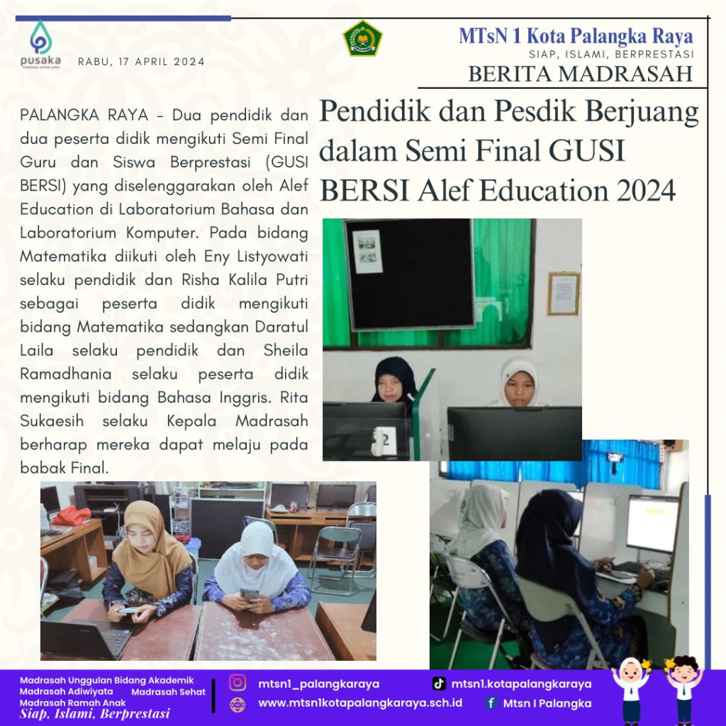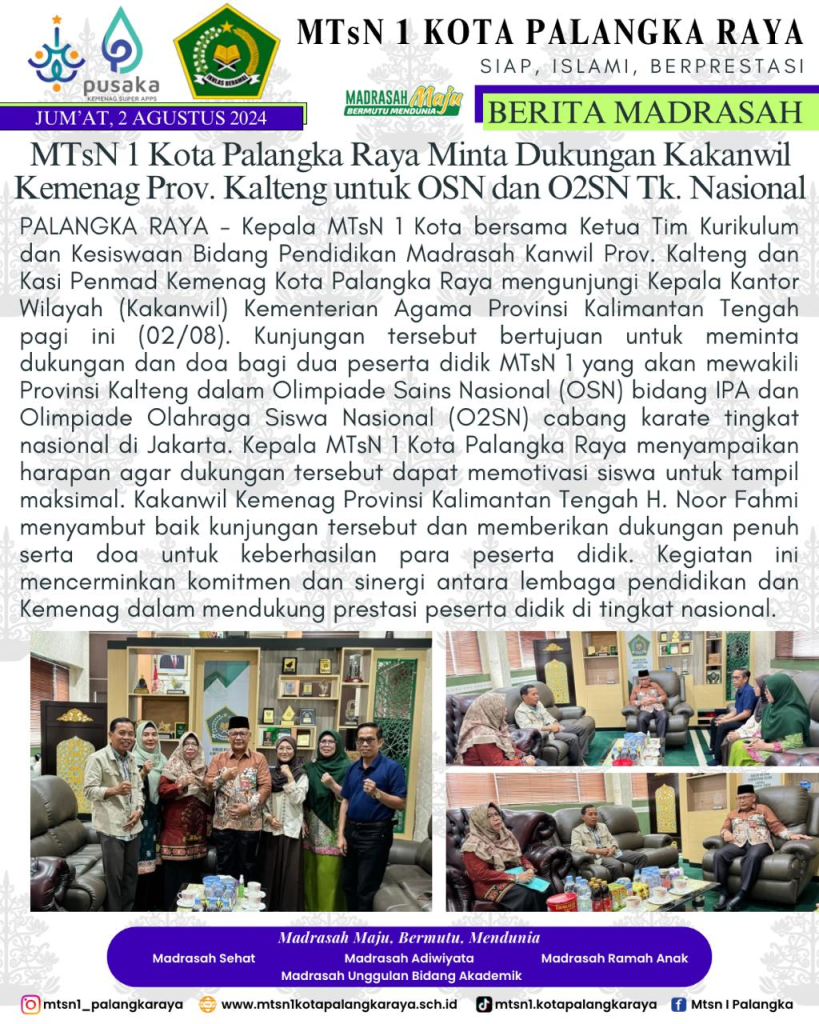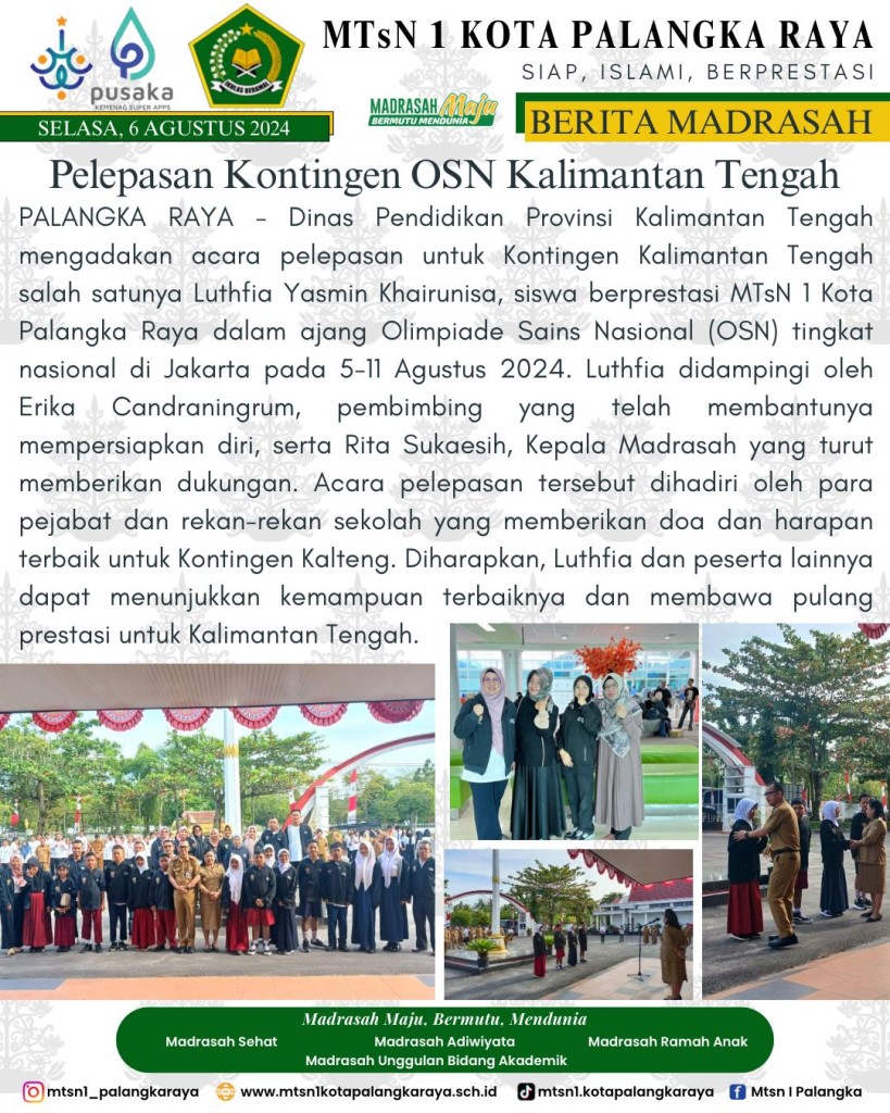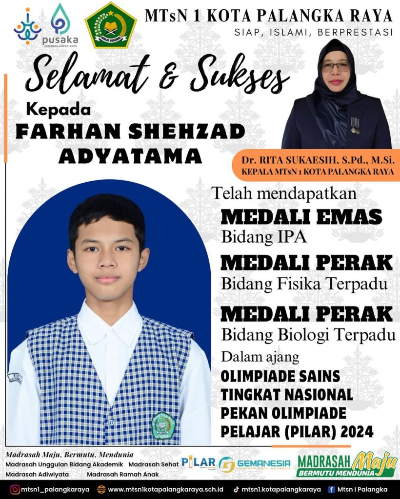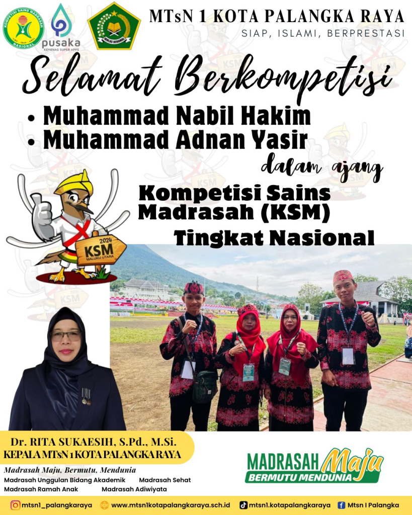 Keluarga Besar MTsN 1 Kota Palangka Raya mengucapkan Selamat Berkompetisi kepada Muhammad Nabil Hakim dan Muhammad Adnan Yasir dalam ajang Kompetisi Sains Madrasah (KSM) Tingkat Nasional 2024 di Kota Ternate
