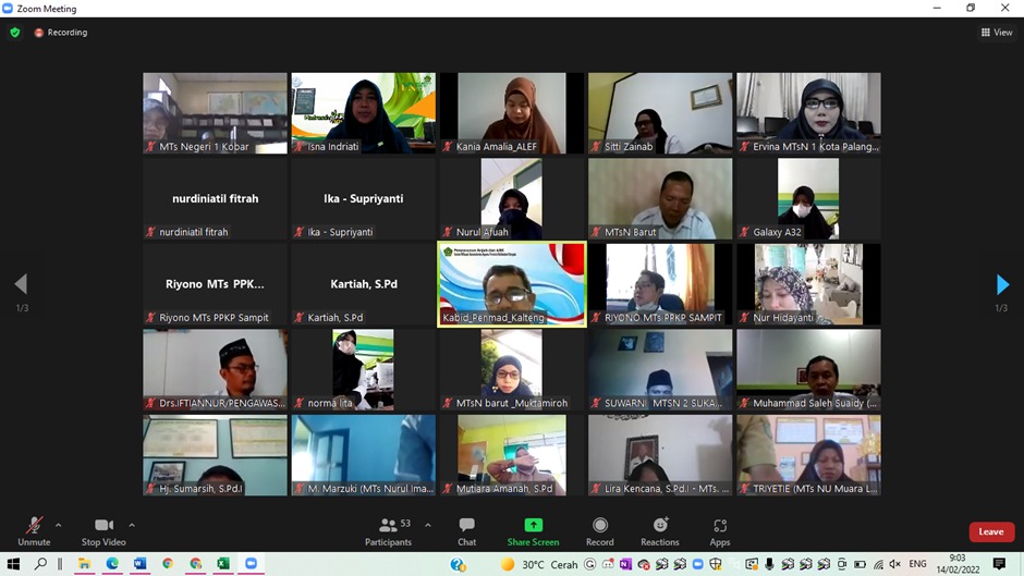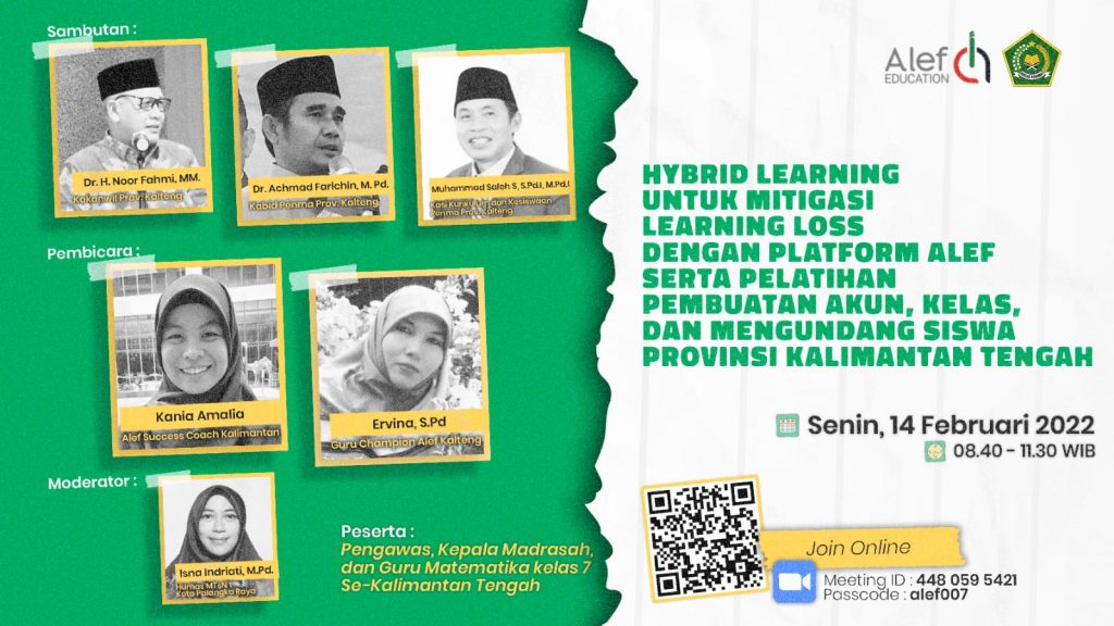 Ervina, guru Champion Alef wilayah Kalimantan Tengah menjadi narasumber dalam kegiatan sosialisasi Platform Alef kepada guru Matematika kelas 7 se-Kalimantan Tengah. Kegiatan ini diselenggarakan secara virtual melalui zoom meeting oleh Pendidikan Madrasah Kanwil Kementerian Agama Provinsi Kalimantan Tengah pada hari Senin, 14 Februari 2022, mulai pukul 09.00 hingga 11.30 WIB. Hadir dalam kegiatan tersebut, para kepala madrasah dan pengawas dari seluruh kabupaten dan kota.